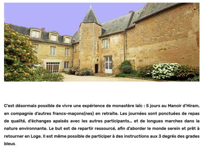 C’est désormais possible de vivre une expérience de monastère laïc : 5 jours au Manoir d’Hiram, en compagnie d’autres francs-maçons(nes) en retraite. Les journées sont ponctuées de repas de qualité, d’échanges apaisés avec les autres participants… et de longues marches dans la nature environnante. Le but est de repartir ressourcé, afin d’aborder le monde serein et prêt à retourner en Loge. Il est même possible de participer à des instructions aux 3 degrés des grades bleus.